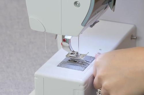 Set the foot down at the edge of the fabric. Move the needle down into the fabric.