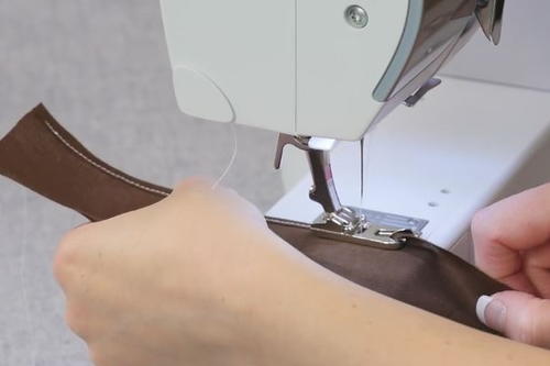 Note: With a turning foot, there is a curved loop. That is what you are feeding the fabric through. You are helping keep the folded fabric moving through the correct parts of the foot. -