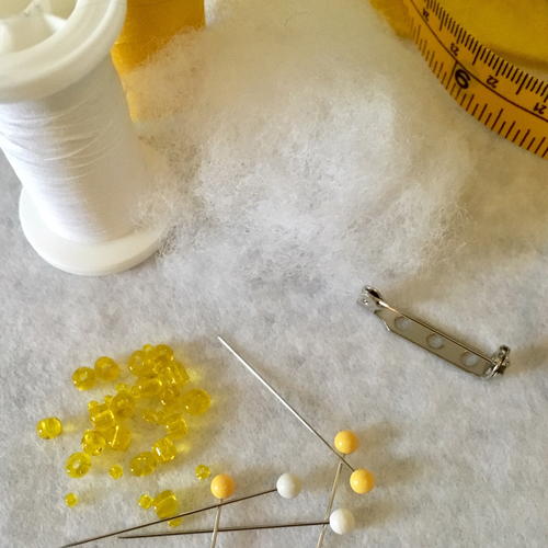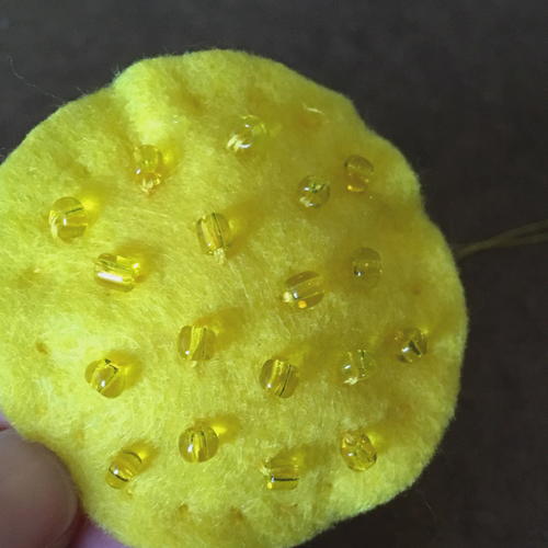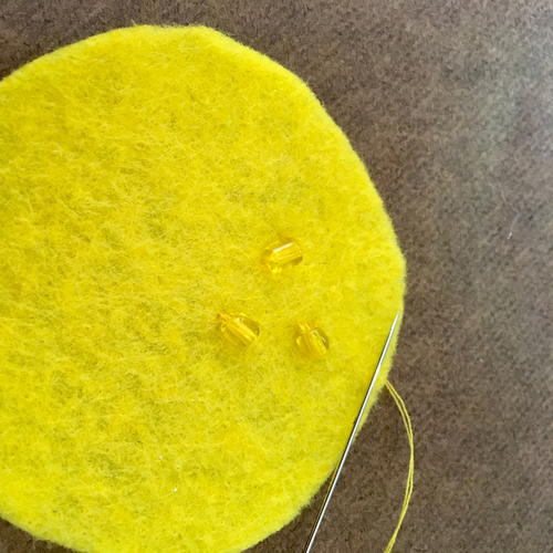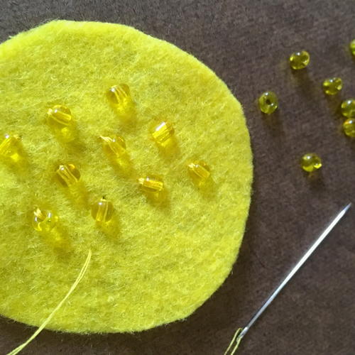 Take the larger felt circle of yellow felt and use your coordinating thread to attach the seed beads. How many you use is up to you and your preference. For this project I wound up using 18 beads, placing them randomly (but evenly spaced) on the felt.