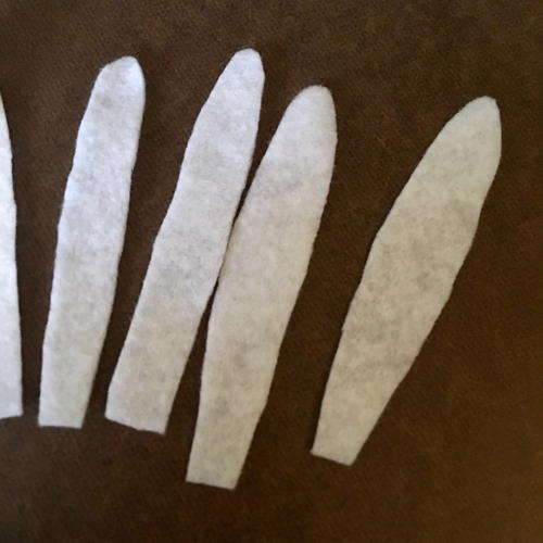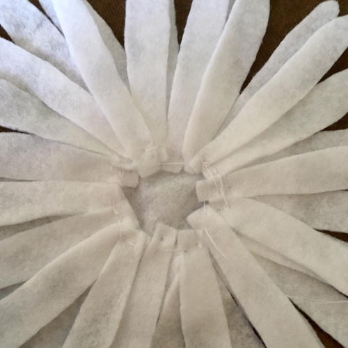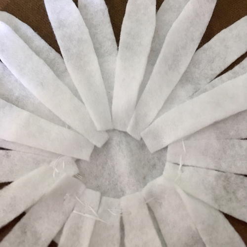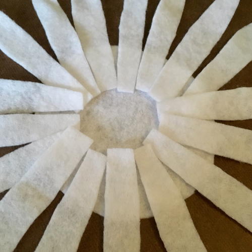 Using your white felt, create 35-40 long rectangular shapes that are approximately 3.5-4" long and 3/4" wide. Then trim and round them to resemble the petals of a daisy (see photos for the exact shape). The felt brooch that is shown in these photos used about 36 petals.