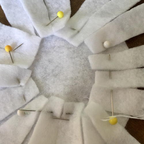Pin the petals onto the base piece in a circle, keeping them about 1.5" from the middle. Then use hand-stitches that go through the felt to the back side until they are secure. Then add another layer on top of that for depth and sew them on as well. The top layer should be placed a little further in, with about 1" open in the center.