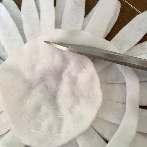 Flip the circle with the petals over so the back is facing upwards. Slowly trim around the white circle so that it's not as visible from the front side. This step shouldn't cut any stitches or petals, so take a bit off and check it from the front before taking more off.