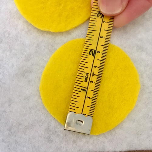 Now it's time to assemble the center of the flower! Cut out 2 small circles in the yellow felt. The larger circle should be about 2.25" wide and the smaller circle 2". They will become the center of your flower.