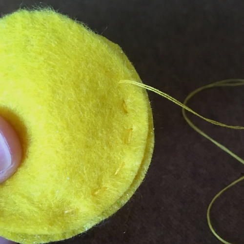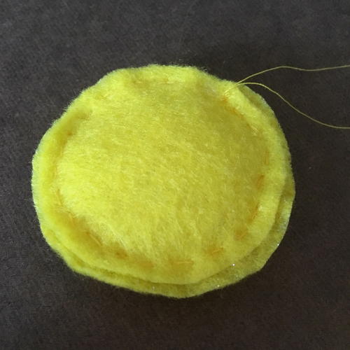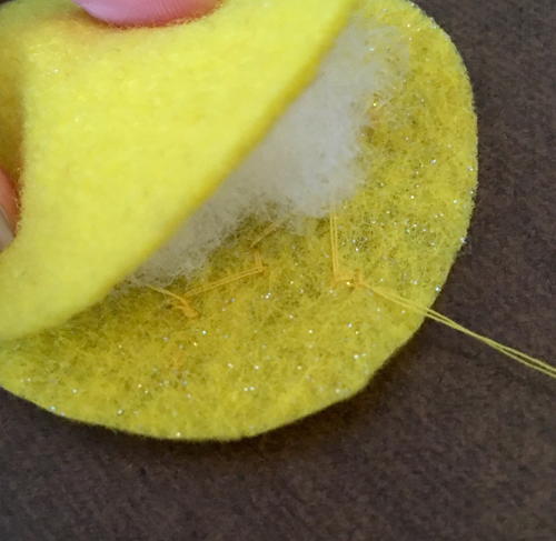 After you've finished sewing on the beads, grab your polyester fiberfill and the smaller yellow circle. Place it between the layers to create depth, making sure it's not sticking out or too full. Secure the yellow pieces together with very small hand-sewing stitches around the edge until you are sure it won't come apart.
