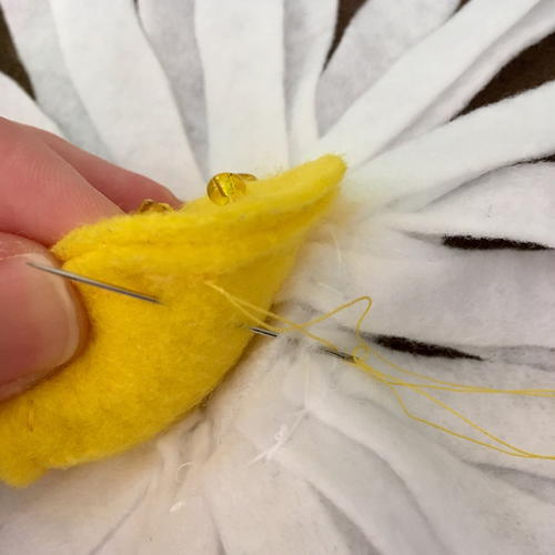 Now you can connect the yellow center part to the base with the white petals. Flip your flower back over so that the front is facing upwards. Use your thread and needle to attach the bottom (non-beaded) side to the center of the base. It's okay to sew through the back of the base piece as it will be covered up in the last few steps.