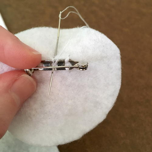 Secure the pin back to this new piece of felt by sewing through all of the holes. Make sure it's attached really well because this is how the pin will stay on your shirt, jacket, or dress.