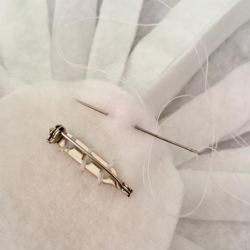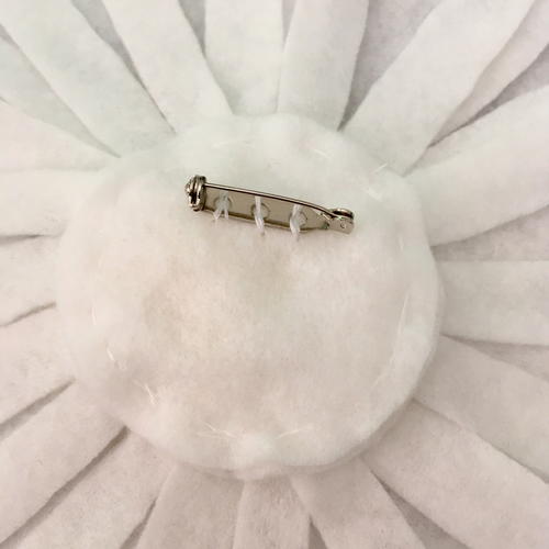Finally, very carefully sew the backing piece with the pin bar onto your flower. If you prefer to use fabric glue that will also work. Double-check that it's connected all around and not loose.