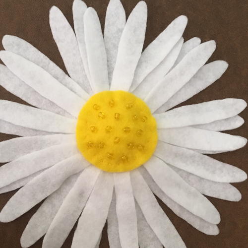 The daisy pin is almost complete! Gently flip your brooch over so that the back is facing upwards on your workspace (I did this on a piece of felt so the beads didn't get scratched). Cut out a circle of felt in white. The size should be large enough that it covers all the stitching on the back, but not so large that it is visible behind the petals.