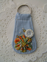 What a cute keychain this is. I like all the decorations, flower, buttons, and beads, and how the maker made several in different colors with coordinating toppings. I can also see this made in fabric of different sport teams for the guys. I was also thinking of using my dads shirts to make memory gifts for the whole family.