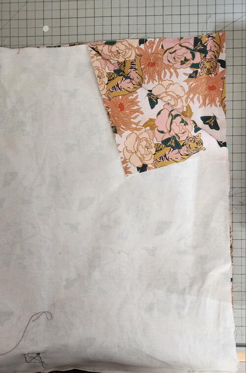 - Center the pocket onto the lining piece, with the top of the pocket about 3 ½” from the top of the lining piece. Pin into place.