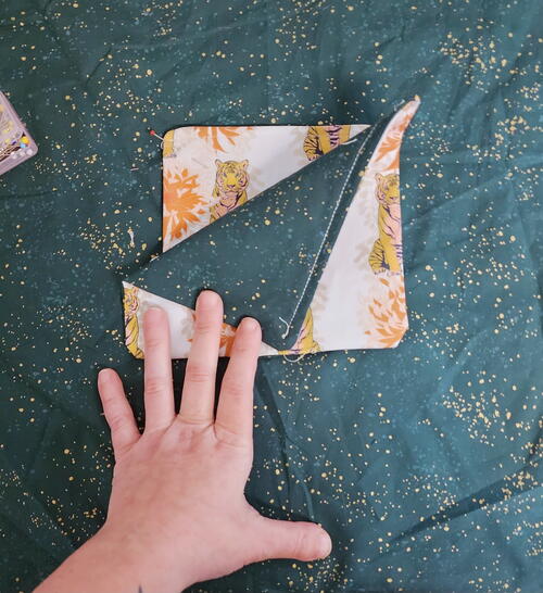 - Fold each corner so that the seams line up, creating a triangle that is 3 ½” x 7”.