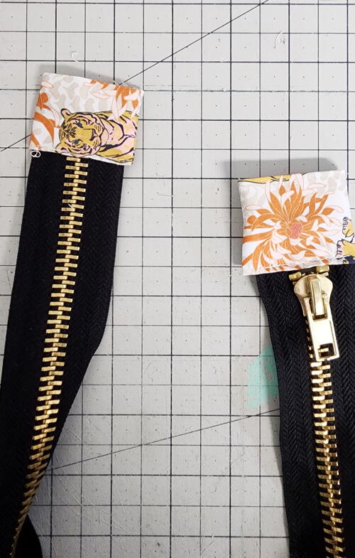- Sandwich the ends of the zipper in between two tabs and clip into place. Making sure the zipper still has 22” of zipper tape exposed.