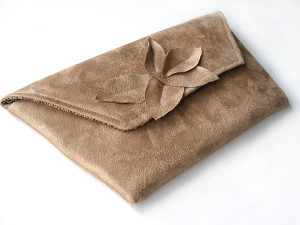 I like the envelope shape of this one piece clutch bag. The same fabric flowers in the photo give some style to the plain clutch. A magnetic snap was used as a closure however I believe and number of simple closures could be used. The faux suede makes for an elegant clutch.