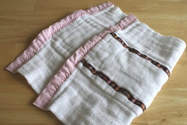 Cloth diapers are perfect to use for burp cloths. Sewing some vertical ribbon rows or rick rack and then using blanket binding to the diaper edges is a great way to dress up the functional cloth. Economical too. I imagine a dozen of these diaper-to-burp-cloths could be made in a very short time.
