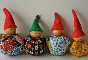 These scrappy Christmas Elves truly seem easy to make and using only a few scraps of fabric, some poly stuffing and a large wooden bead. Best to make several as they are charming as a mantel decoration, under or even perched in the Christmas tree, or to adorn a wrapped present. I plan to make several!
