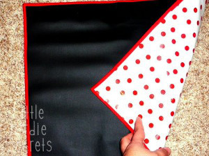 Chalkboard placemats are a nifty way to keep kids entertained in the kitchen. Never would have thought of such a charming idea. Sewing the fold-over bias tape neatly is somewhat of a challenge. An alternative might be to first sew all around the edges with a straight stitch then use pinking shears to neaten up the edges.
