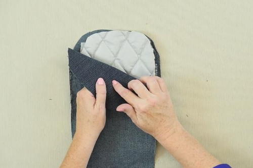 Turn your sewn oven mitt right side out. Do this by putting your hand in between the two right sides of the denim fabric and pulling it outward.