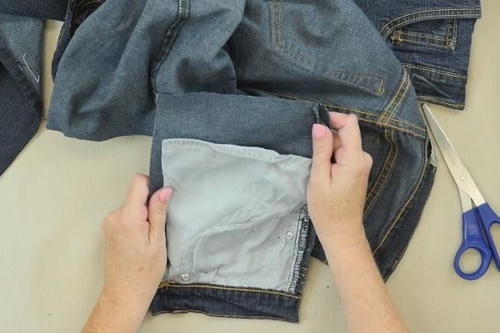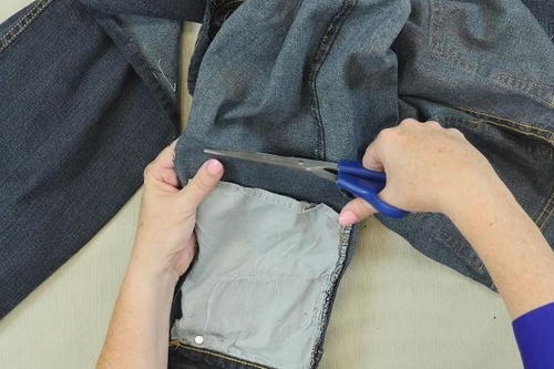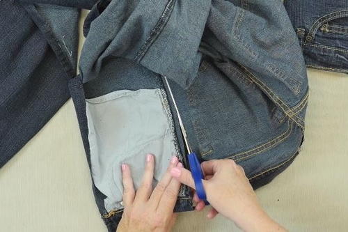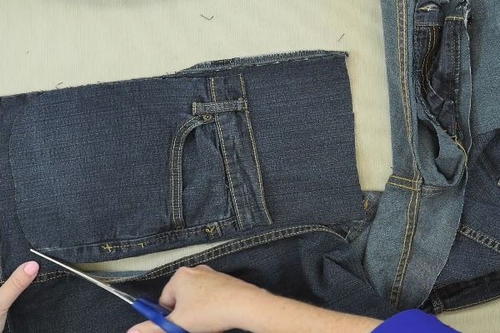 Cut out the sides of the pocket part of the jeans, with about an inch or two outside the pocket. Be sure not to cut into the pocket.