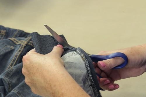 Tip: If your jeans have a rivet near where you are cutting, cut outside of the seam so that you won't be sewing near it. -
