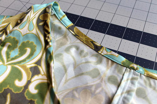 Finish the neckline of the dress by stitching the bias cut fabric strip around the neck. Press to the inside, fold up the raw edge to conceal, pin and sew in place.