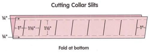 To make slits in collar for weaving ribbon, fold one collar piece in half lengthwise. With fold on bottom, use marker to lightly draw a line ¼" above fold and ¼" below edge; lightly draw a 1½" vertical line 1" in from each end. Beginning on end line and ¼" bottom line, mark an even number of 1½" vertical slits equidistant across collar (slits as shown are 1½" apart). Cut slits with fabric scissors, through one layer of felt only, cutting last slit on opposite end line (see illustration below). Trim ends of collar with pinking shears. Measure, mark, and cut second collar piece.