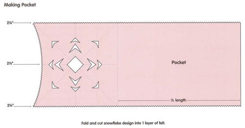 To cut pocket front snowflake design, fold curved pocket edge up to halfway mark made in step 7. Mark the fold; this section with the curved edge is the pocket front. Fold this section into quarters. Folding folds tightly and using sharp scissors, cut out tiny triangles on quarter folds to make snowflake design; unfold and press. Cut out a scrap of lining felt the same size and shape as pocket front. Place behind snowflake and thread tack. In same manner, cut and line second pocket.