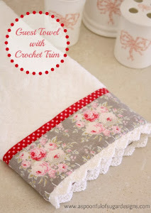 Can't find that perfect towel for your bathroom then look no further make your own. This starts with a plain white towel that can be purchased for very little, some small yardage of fabric that you may even have on hand and some crochet trim that you can make yourself or can even purchase already done and a very little bit of sewing and it is done. So super easy and looks like a lot of fun. Use in your own bathroom or a guest bathroom. You will have everyone asking where you got these but do not tell or you may be making a lot for others. Give out as gifts for special occasions.