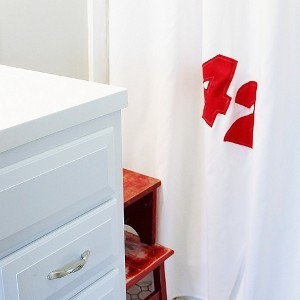 Looking for a fun way to add a splash of personality or color to your bathroom? Then check out the Lucky Number Shower Curtains. This insanely quick applique sewing project shows you exactly how to make a fun set of simple shower curtains. In an apartment or small space, it can be hard to find ways to decorate your bathroom. The shower curtain is the best way to add some fun without taking up space. Plus, it is super cheap!