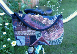 I think this could use a little strap that can be tucked in while on back and pulled out when off bike so it could be used as a purse also. Love this idea and I am going to try it out. You could use more of the double fold bias tape for the strap or get a little more creative with it.