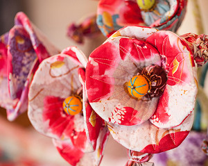 - To make the buds, cut seven 6” (15.2cm) circles of small print fabric. Fold in 3/4” (1.9cm) and sew a gathering stitch 1/16” (.2cm) above the raw edge through both layers. Insert craft foam egg and pull gathering stitches up creating a ruffled edge at top of bud. Tie off threads to secure. Use hot glue to attach the other end of the bud to the top of the bud stems. Stand finished buds in tall vase filled with marbles or stones to allow glue to dry completely before handling.
