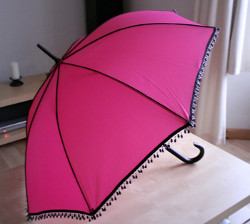 Thank you Marooka! The trim is stitched onto the outside of the umbrella with the beads hanging over the edge. I machine stitched in between the ribs but handstitched over the spines.