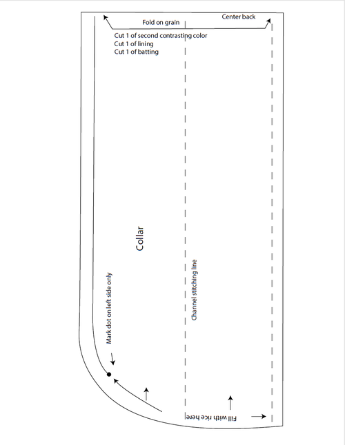 Fold the other side over not quite to the center. Leave enough bias binding loose to cover the left side center front and topstitch to the collar starting at dot of upper left edge of center front around the curve of the right side center front stopping at the bottom edge of right center front. The left center front edge is left open for now for the rice insertion into the collar channels. -