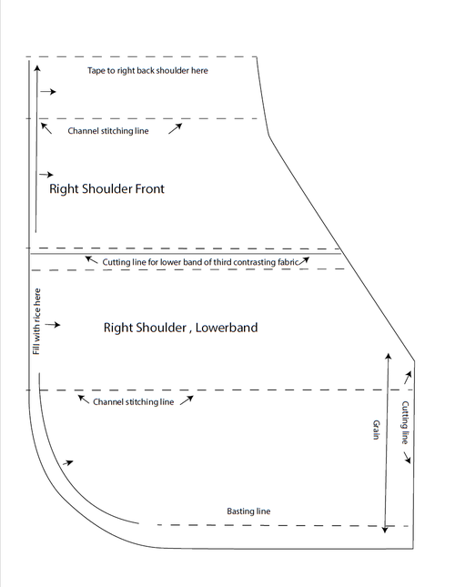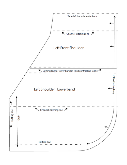 From third fat quarter, cut: 1 Lower Band each for both left and right Shoulder using pattern cutting lines