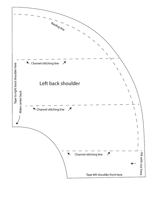Fill shoulder piece channels loosely with rice leaving a 3/4” (1.91 cm) wide space when top and lining are pinched together. Once each channel is filled, pin together 3/4” (1.91 cm) away from the edge. This will allow enough room for the presser foot to pass unobstructed and more surface area to touch the skin if the channels are not stuffed too tightly. Baste 1/4” (.64 cm) away from the outer edge of the shoulder piece.