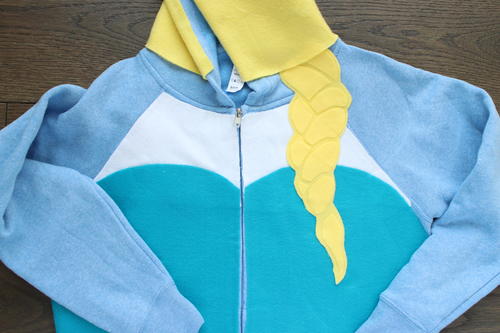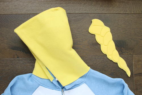 Cover the hood with yellow felt. Adhere it to the hoodie. Put the braid together.
