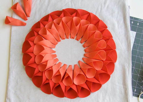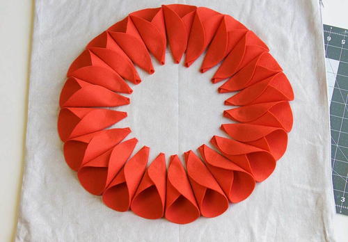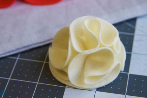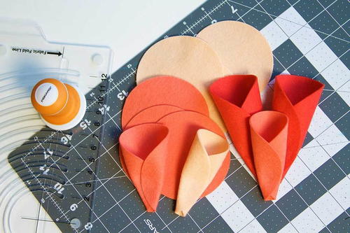 Fold two sides of each circle in towards the center and glue in place with a hot glue gun. Repeat for every felt circle.