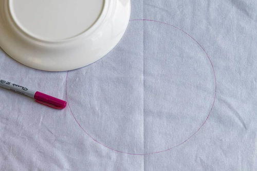 Draw a 10” diameter circle on the center front of your cushion cover. Tip: trace around a dinner plate for a quick, accurate template.