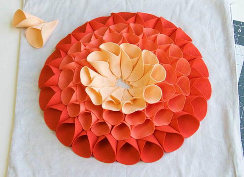 To create the flower's center, fold 5 circles into quarters and glue them together. Adhere each of the folded circles on the remaining size 2 circle and glue to the center of the cushion.