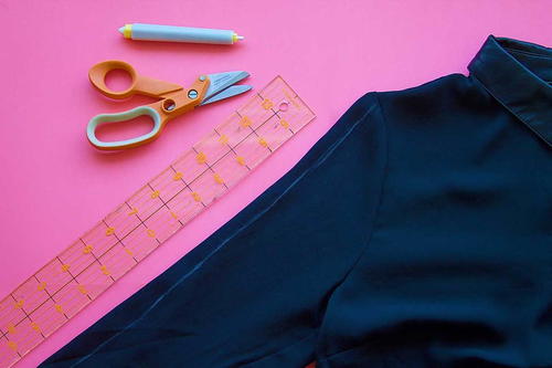 Use the 6” fabric shears to cut along the chalk line through both layers of sleeve fabric. Be sure to start your cut just below the shoulder seam and to stop the cut just before you get to the cuff as you will want to keep the seams intact. When finished, you will have a cut out channel, running the entire length of the center of the sleeve. Repeat step 1 and 2 for the second sleeve.