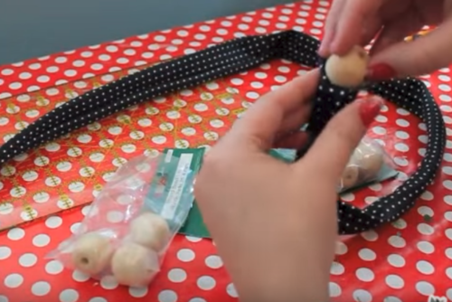 Now it's time to add the beads. I'm using 8 1-inch wooden beads. They cost about $1 per package, but you can experiment and buy whatever is on sale at your craft store, because they won't show.