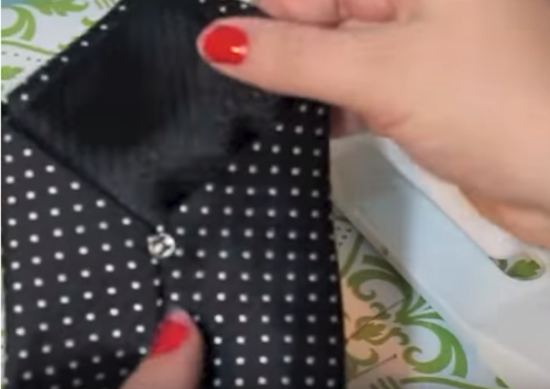 Now we'll add a snap. Hand sew one piece on the interior of the point. Sew the other snap piece where the fabrics meet. Make sure that when you fold the flap down, the two pieces match up.