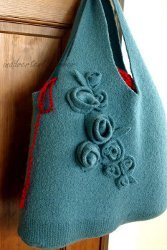 What a great thrift find to acquire a 100% Alpaca wool sweater to felt to make this project. The tutorial that accompanies this article is clear and easy to follow. Every bit of the felted sweater seems to have gone into making this yarn or market tote. The floral embellishments are lovely.