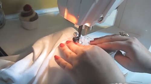 Now we’ll insert the ribbon into the casing. Feed it through using a safety pin or bodkin. Pull it through the other end and unbunch the fabric. Cut the ribbon long for now so you have room to make adjustments when the shrug is tried on. It’s also smart to singe the ends of the ribbon to prevent fraying.