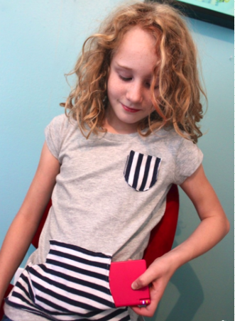 Although my daughter loves this shirt as-is, I can’t help adding a girly touch to it. Ruching sleeves is a super simple way to add femininity to a garment. Turn the tee inside out. Sew a 1/4-inch wide piece of elastic from the shoulder to the cuff. Pull the elastic tightly as you sew. When you’re finished, the elastic will shrink and ruffle the sleeve.