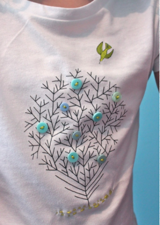 Finally, I’ll hand embroider a running stitch beneath the tree. This shirt has a hand-made, hipster feel.
