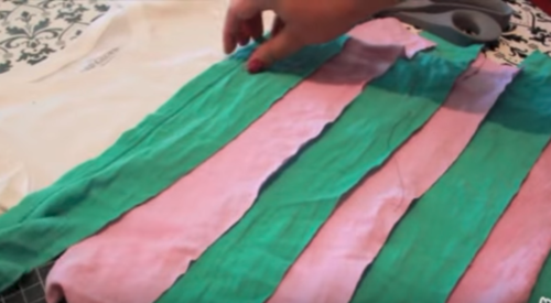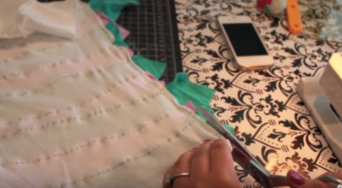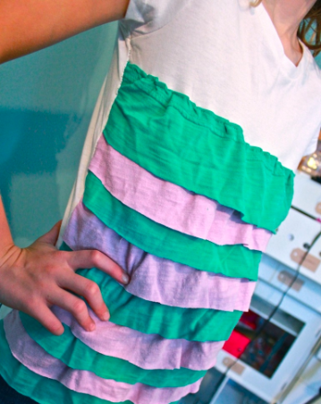 Lay them out on your shirt so you can see how many you’ll need. The final layer will go right beneath the arms. For this ruffle, you’ll be using the hem of an old tee, because it’s already finished nicely.
