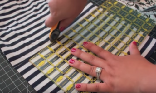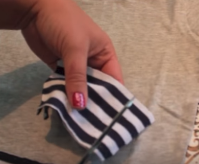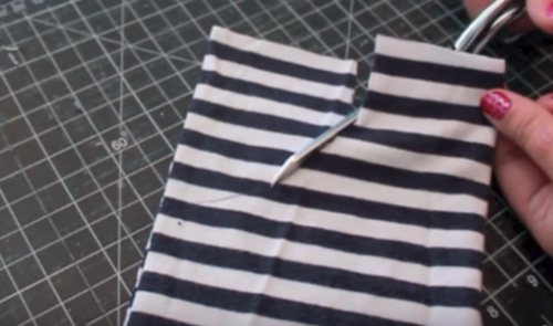 Next I’ll add a little pocket on the chest. For added interest, I’m turning my fabric so the pocket has a vertical stripe. Cut a rectangle from both layers of the spare tee, then trim the bottom into a U shape. Sew the layers together at top.