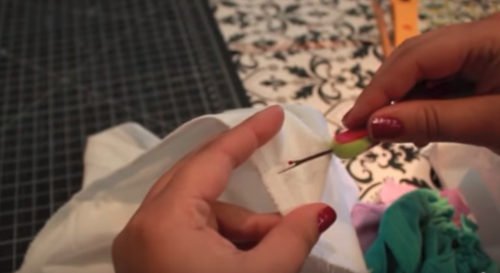 Once you’ve added all the strips, turn the shirt inside out. Line up the side seams and pin. Sew together with a zig-zag stitch. Then trim off any excess fabric.