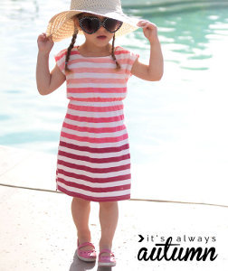 Taking your girl to the pool can end up being a very big and disorganized adventure. Changing in and out of suits in a busy pool bathroom or beach restroom is just too much hassle. Avoid that switcheroo by making your little lady this insanely easy DIY Swim Coverup Pattern. This swimsuit cover up is quick to make and guaranteed to fit. Pair this free girls dress pattern for the beach with the right sunhat and sunglasses to make her look like a real star.