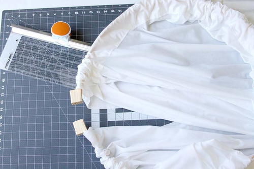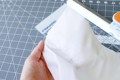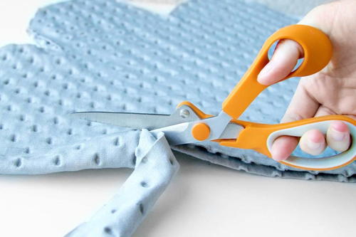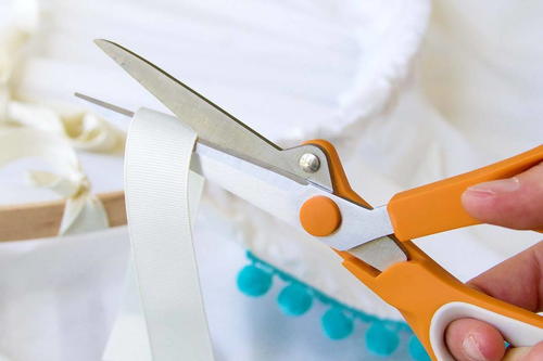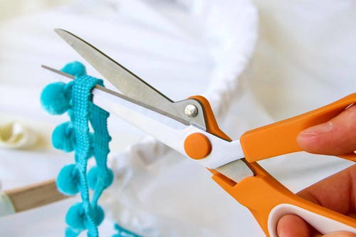 Use the 8” fabric shears to trim the decorative pom pom trim to the same length as your fabric panels. These scissors are versatile and will cut through the variety of materials used in this project.